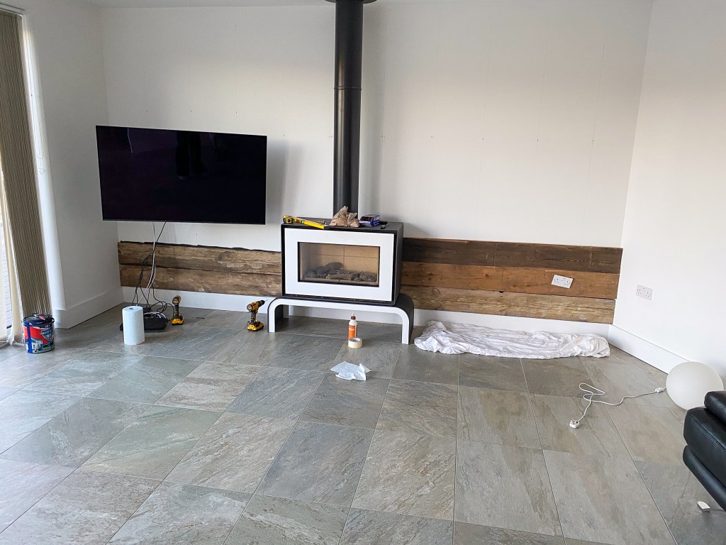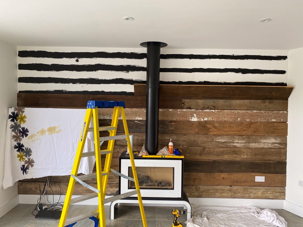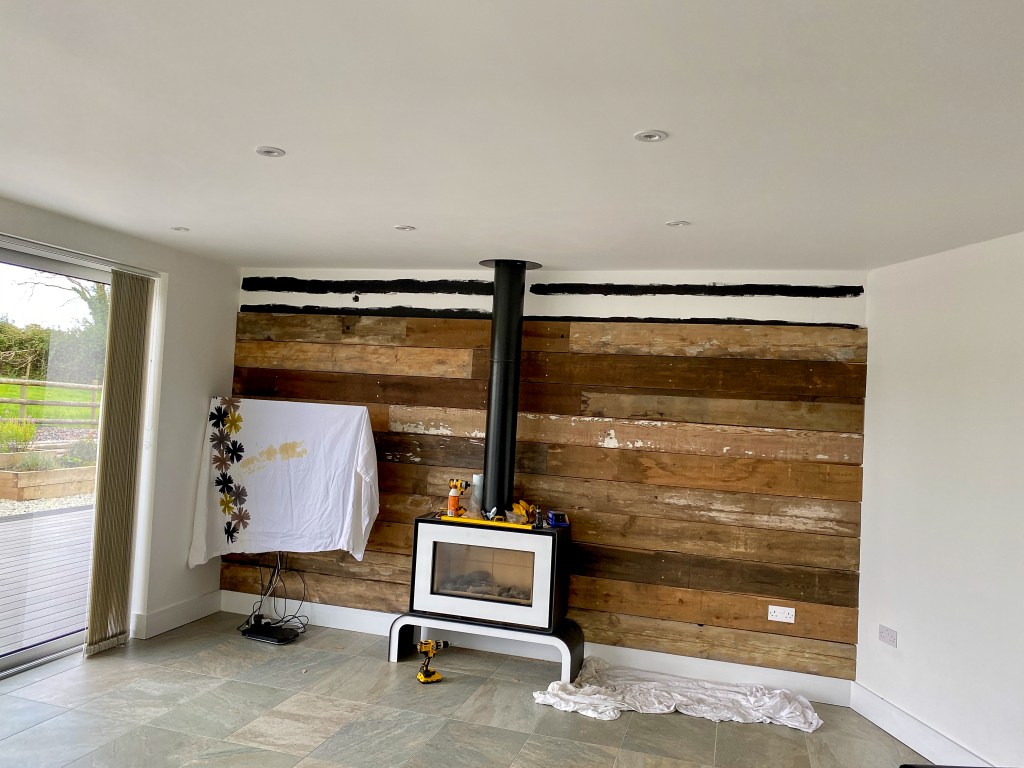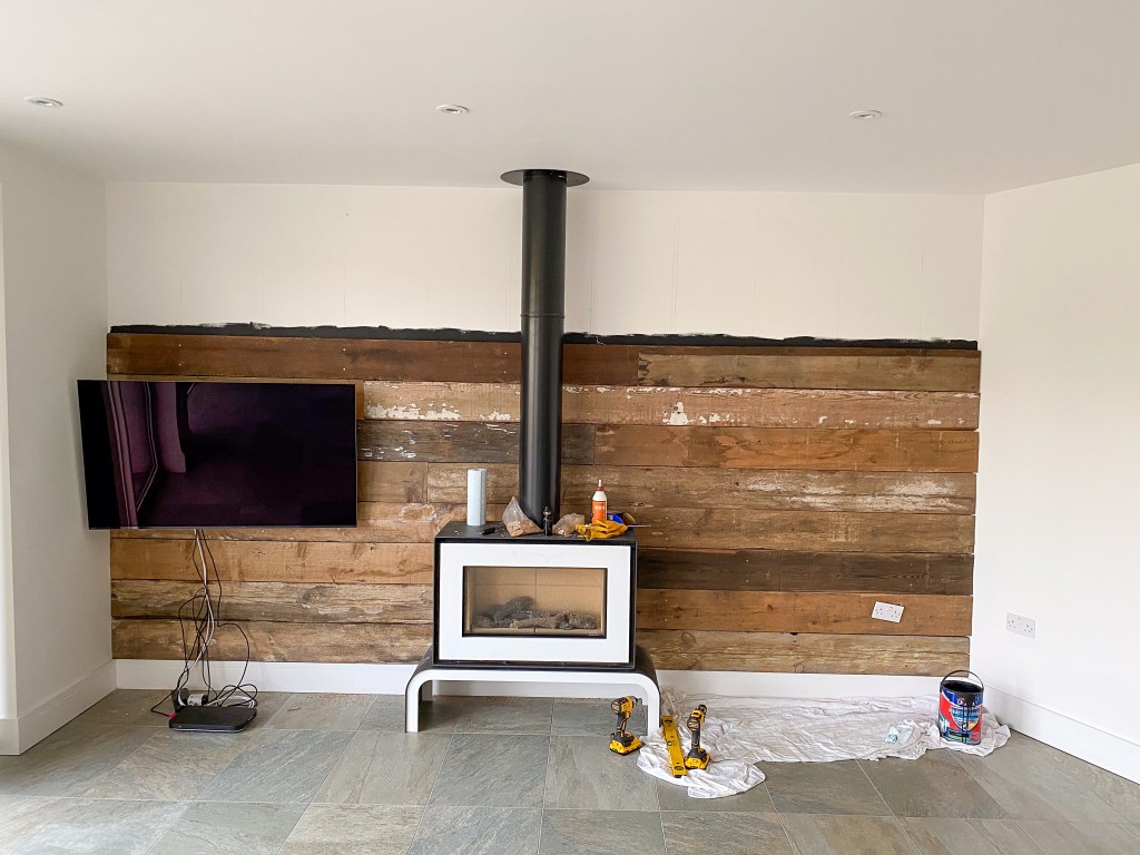 I left a 2mm gap between each board so painted the white wall with black paint so the gaps didn’t show up. In the space of a few hours, the wall was up. To say we’re chuffed with the difference it’s made is an understatement. We’ve created a whole new feel to this end of the large room and we use it more than any other area in the house. The contemporary gas fire adds to the cosiness in the winter and the combination of old/new matches in well.