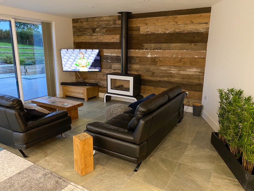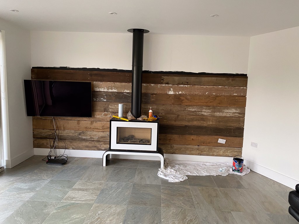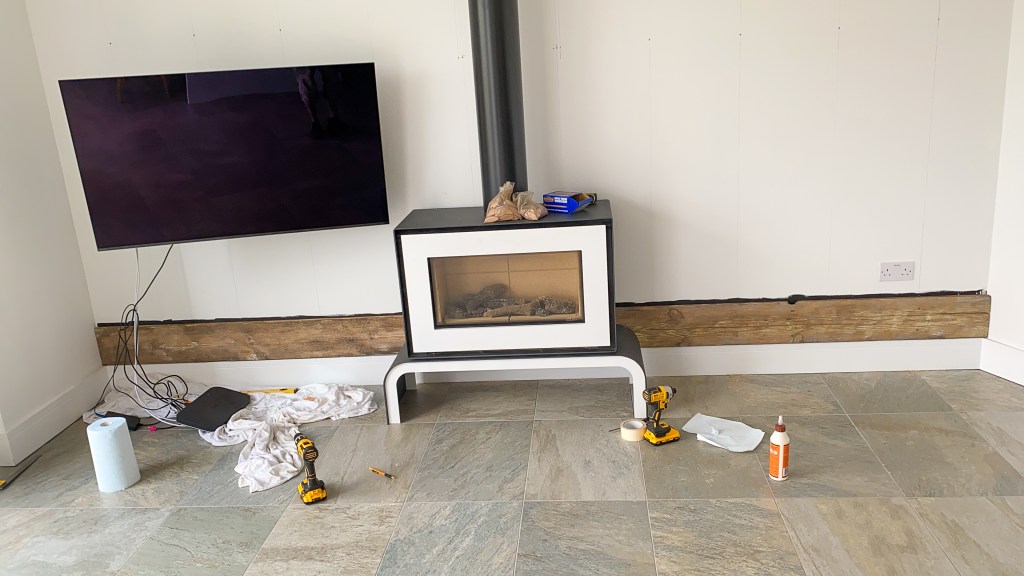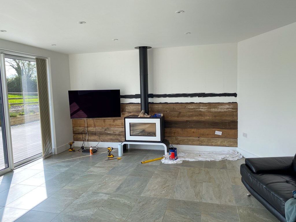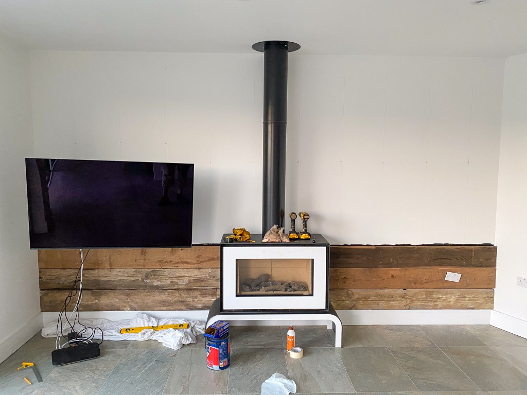 I left a 2mm gap between each board so painted the white wall with black paint so the gaps didn’t show up. In the space of a few hours, the wall was up. To say we’re chuffed with the difference it’s made is an understatement. We’ve created a whole new feel to this end of the large room and we use it more than any other area in the house. The contemporary gas fire adds to the cosiness in the winter and the combination of old/new matches in well.
