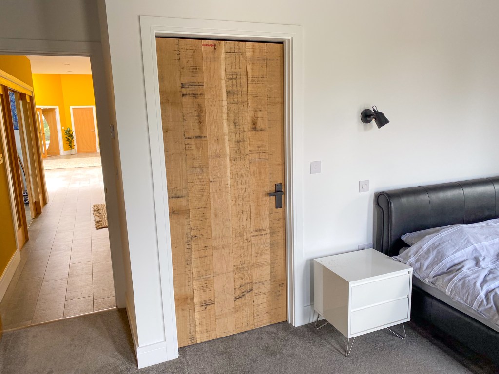 I’d deliberated about treating the wood with oil or something to protect it. In fact, I became obsessed with the options I had. I wanted to preserve the texture for sure but should I treat them? Every single article I’ve read says you have to protect them. Would the rough face snag clothes? How much do you lean on a door when opening and closing? Being a belligerent so and so, I needed to know why. The answer, I think, is that solid oak swells and contracts with the moisture in the air. Putting a protective shield around it, helps to reduce this movement. It also prevents stains from spillages or even oils from hands etc marking the wood. However, after deliberating for ages, I decided to leave it raw and see what happened. Would it cope or would it swell so much it wouldn’t close properly when fitted? I didn’t have that answer yet but vowed to keep a watchful eye on it over time. I could always oil it later if necessary.