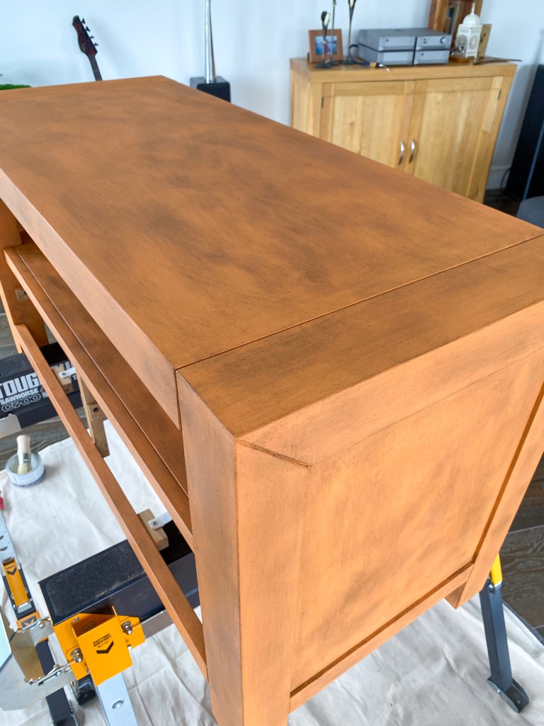 After painting the unit, a breeze again due to not having to prepare the surface, I realised my decision was just a little too bold. The orange was a bit brighter than I’d hoped. I decided to tone it down, and give it a more ‘used’ look by applying a black wax finish rather than a clear one. Applying this was a bit harder because it’s, well, black! I had to apply with a brush and then use a rag to try to give it a more random effect and remove some of the harsh black. It was tricky to get looking natural but was fun to play around with.