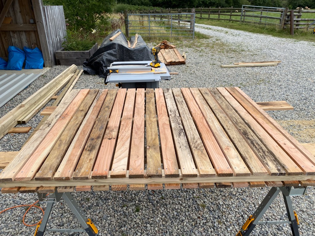 I started the laborious task of ripping each board in half to create two battens. For this I’d purchased a cheap table saw from the local tool shop for a total of £110.