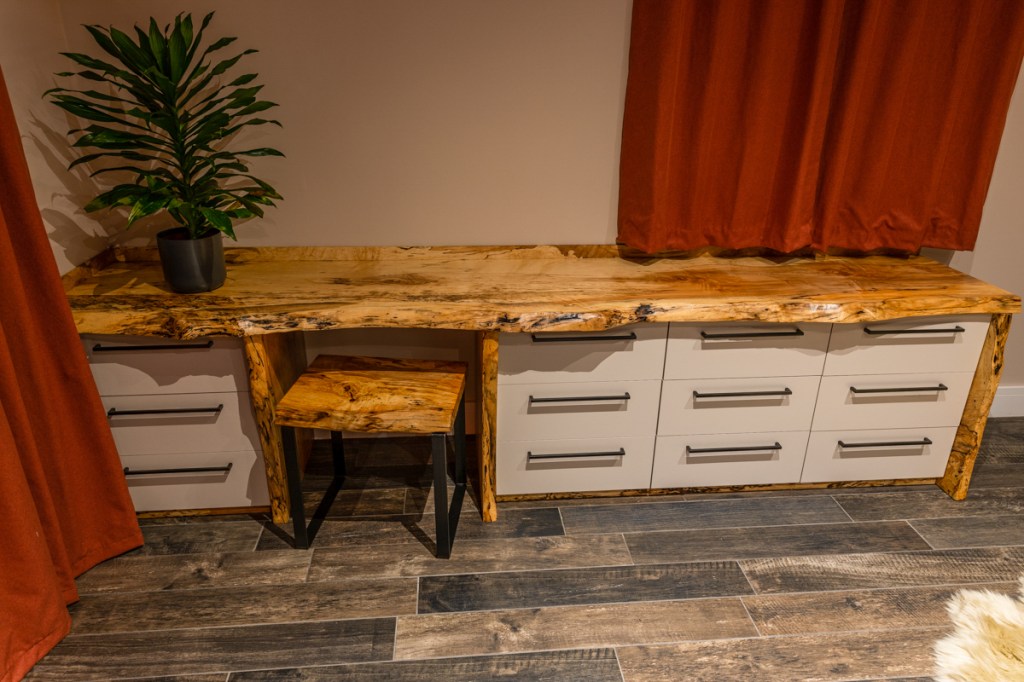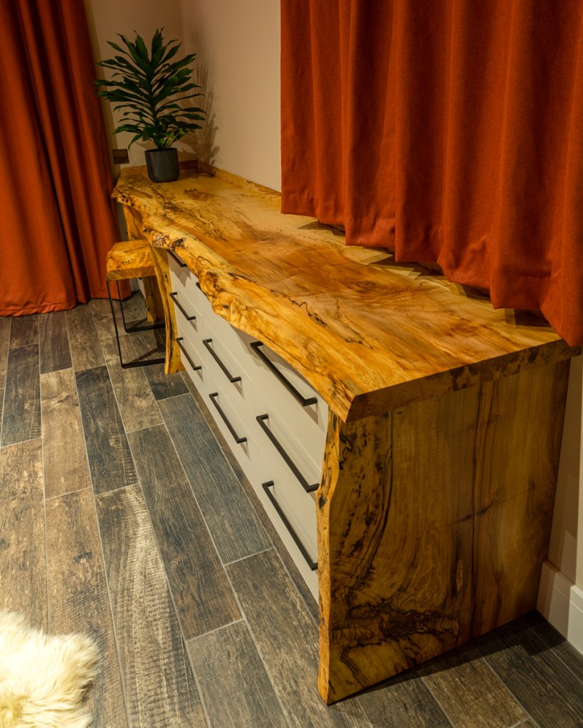 Costs: Drawer Fronts x 12 £155, Handles x 12 £80, Stool Legs £35, Oils & Preserver £200, Spalted Sycamore £1,332 = Total £1,802
