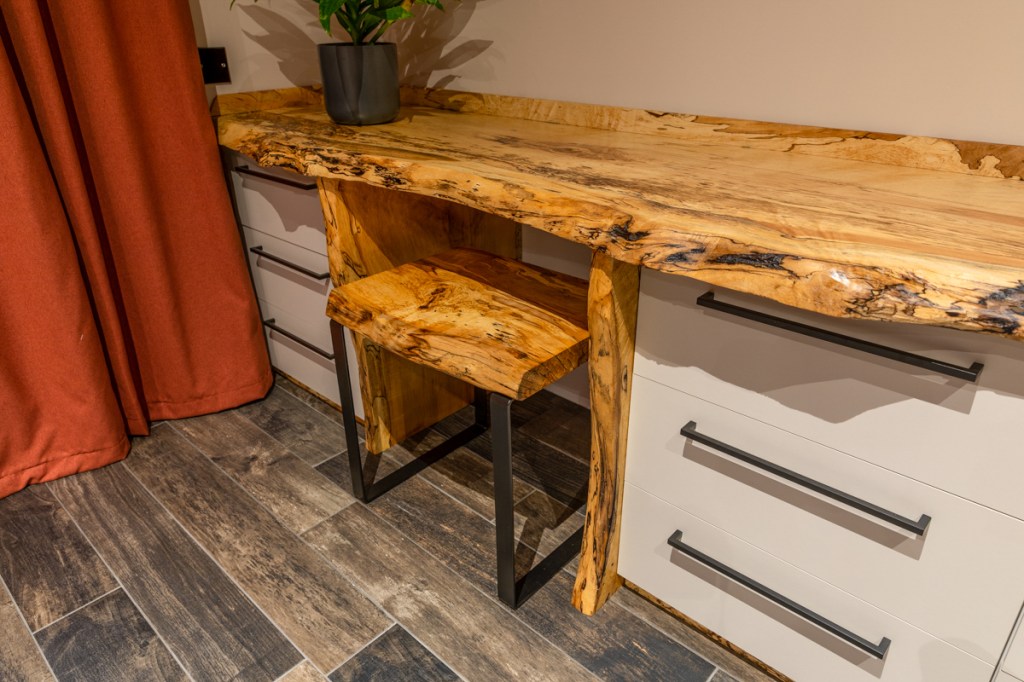 With an off-cut from the slab I decided last minute to make a stool for the dressing table gap. This was really easy after ordering steel legs, again, from an Etsy trader.