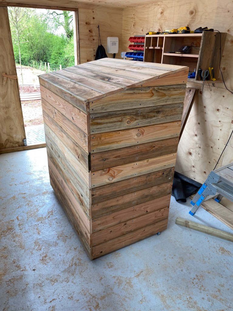 As you’d expect, nothing revolutionary, a box frame, a breathable membrane wrapped around the frame, leftover larch cladding and a sloping roof. To solve the ease of moving, a set of casters on the bottom.