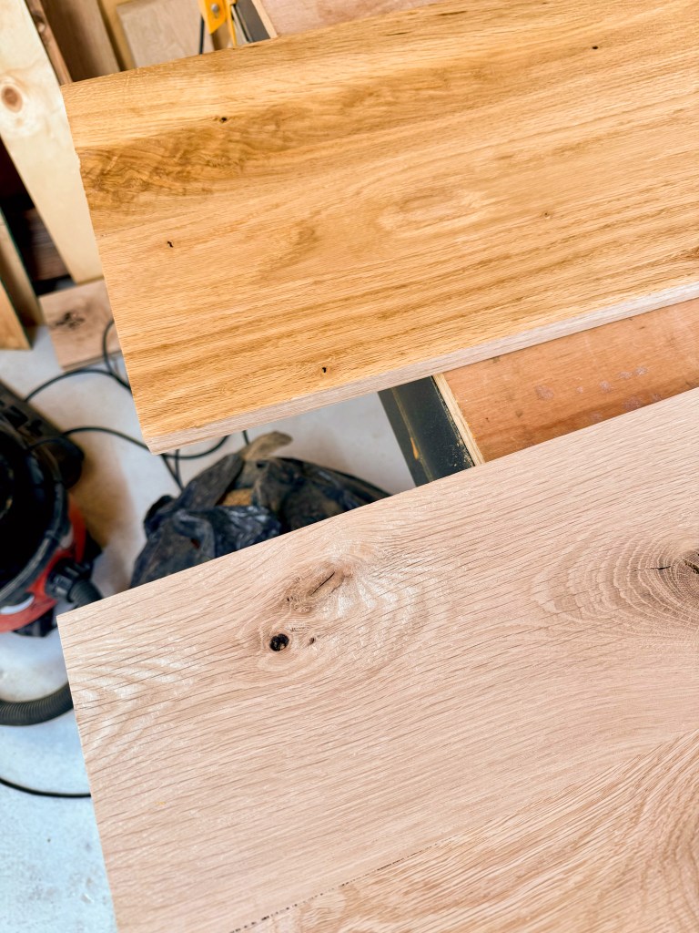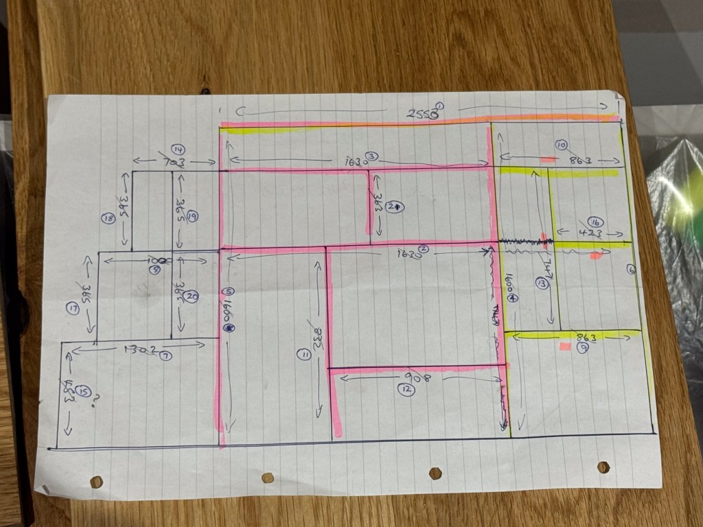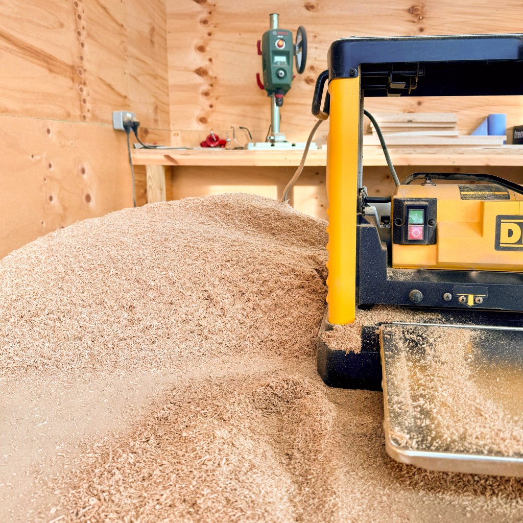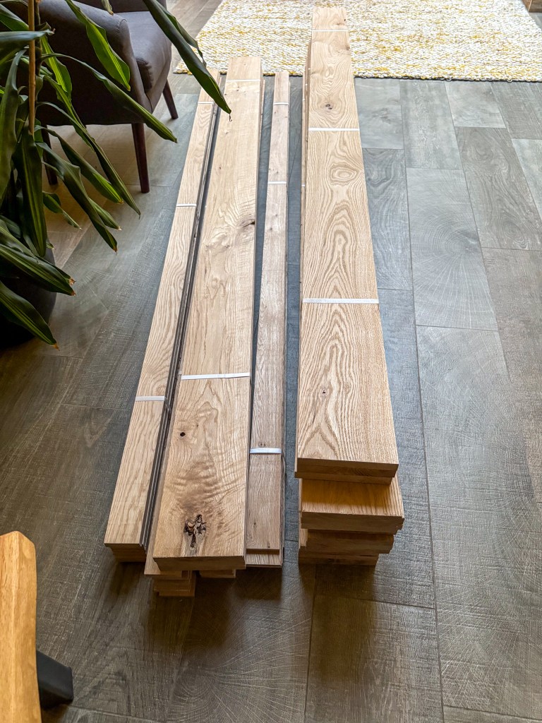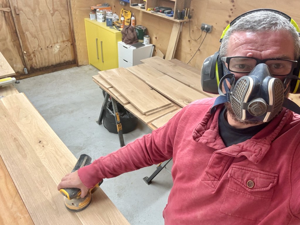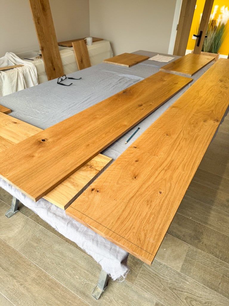 For the shelves, I looked at trying to source wide 300mm lengths and although available, were a ridiculous price. I opted to go back to trusty Winkleigh Timber, our local wood yard, and order boards at 150 mm that I’d join to make the required width.