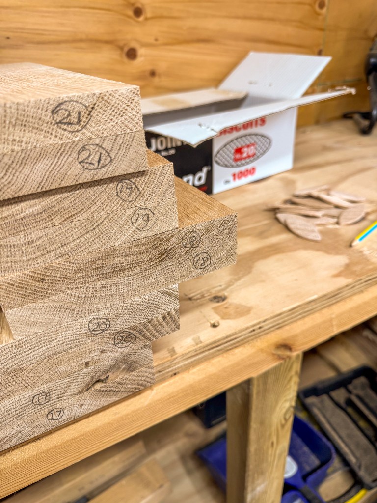 With all ordered I awaited the delivery, first of the boards, then the worktop. I set to work almost straight away on the boards, carefully cutting lengths as per my plan. I even numbered each piece and crossed each one off my cut list to avoid duplication and errors. Once I had them all the right size, I started to biscuit join the lengths together for each component. I was careful to make sure each set of shelves that made up one section were exactly the same length so as not to throw out the uprights. It was a long and painstaking process that took longer than needed but meant the pieces were as accurate as I could get them. Glue ups were also slow as I only had a set number of clamps. There was no rushing this job.