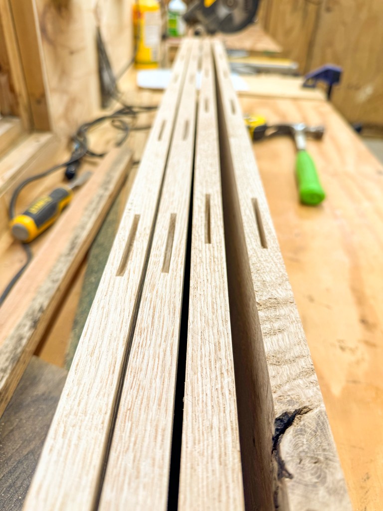 Once that was done, I planed them all down to an even thickness using my Dewalt Planer/Thicknesser. That was again fun and messy! By the time I’d made up all the pieces I was pretty sick of the sight of oak boards! However, the imagined end result kept me going. I ended up with 21 lovely, straight pieces that would eventually make up our new shelving unit.