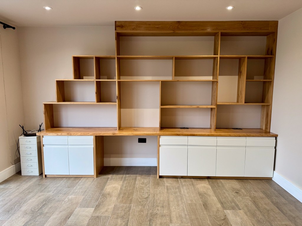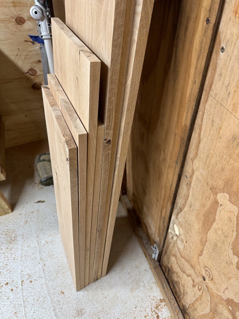 I wanted the base that would sit on the cabinets to be one thick solid piece of oak that’d be over 3 metres in length so not easy to source. The shelves would be oak, meaning I’d have to make them up individually. The cabinet sides, also oak but thick like the worktop. I sourced the big oak slab from a mill on Dartmoor and it was an impressive piece, fully kiln dried and ready to go. They offered to machine it to the correct thickness and make the cuts to size. Result.