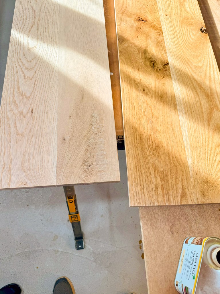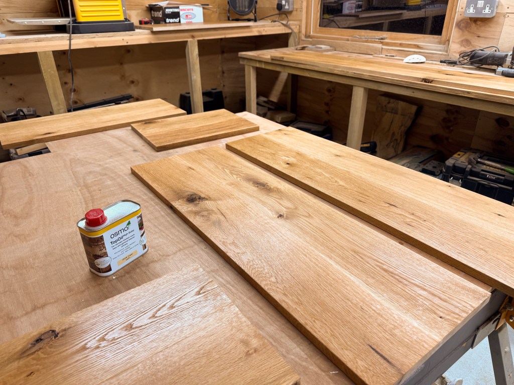 I quickly sanded all sides with a 240 grit paper on my palm sander. The last task was to cover them all in two coats of Osmo Top Oil. I used my now-trusted method of a lint-free cloth (small cut pieces from an old T-shirt) and simply wiping the oil on evenly and thinly on all sides. Again, this took a long time due to the number of pieces, the two coats, both faces and sides and lack of drying space! I gave them at least 24 hours drying time between coats which is probably more than necessary but I guess there’s no point in rushing and ensured consistent and even results.